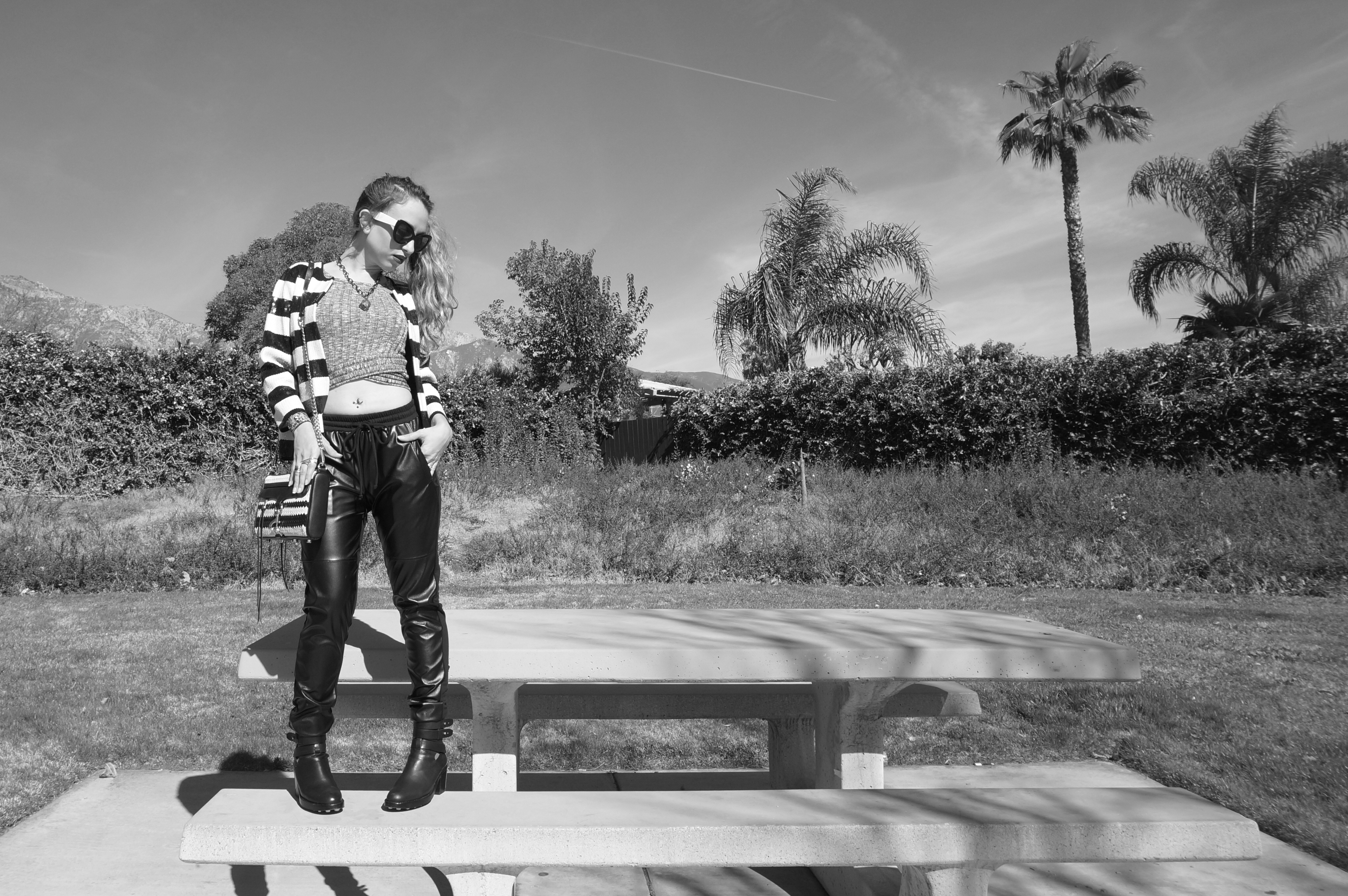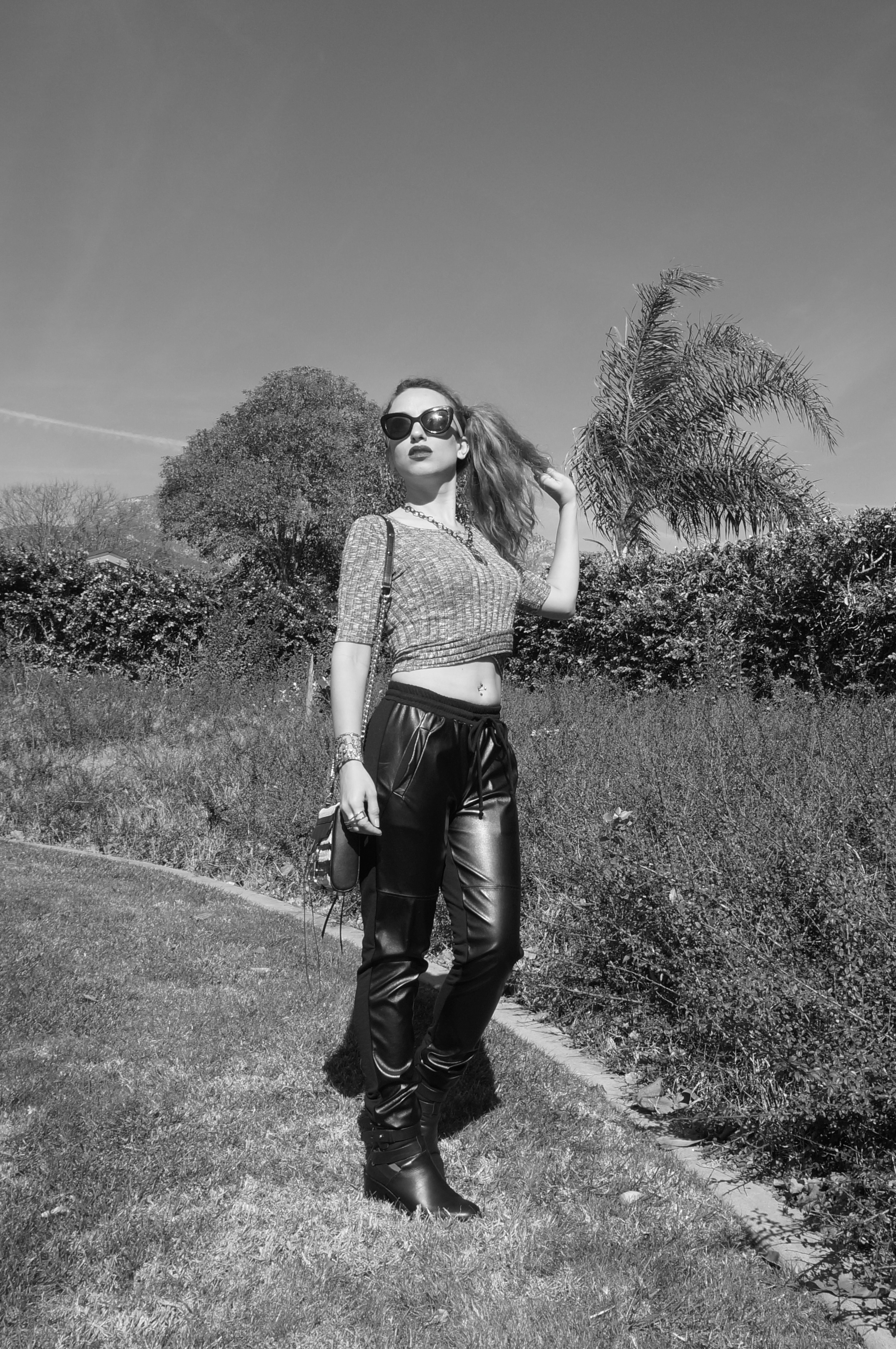 I’m a huge proponent of experimenting with style! I don’t believe in “playing it safe” and I love trying out different looks to suit my mood. When I spotted these faux-leather slouchy pants (at Nordstrom Rack) I knew I had to have them, and because they’re slightly higher waisted, I figured they’d pair well with a crop top…