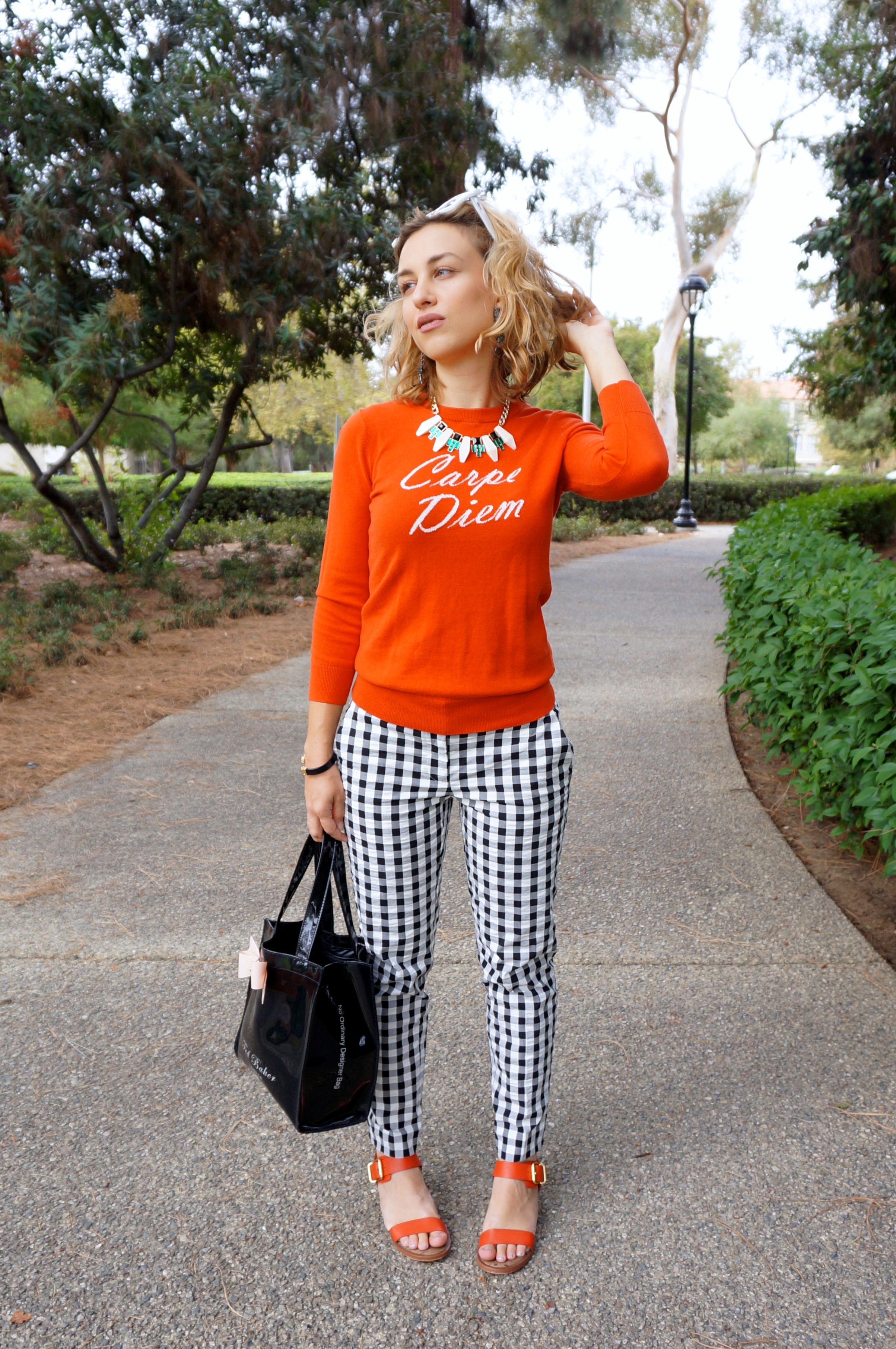 As I sit and write this, it’s actually cold and rainy outside, and it finally feels like fall is here! A few days ago when I shot this look, it wasn’t quite as cold, but it was overcast and cool enough to wear a little sweater. I styled this outfit because I wanted to show how easily you can transition a spring trend into fall. Gingham was probably the standout spring print. Florals and stripes are always big for spring, but this past season gingham was the fun, fresh wildcard. It’s incredibly versatile however, because black and white prints have classic, seasonless appeal. These particular pants are not heavy enough for a cold winter day, but they definitely work for a cool-ish fall day. I could have layered a lightweight coat or jacket for additional warm, and opted for booties instead of sandals, but again it wasn’t quite that cool. I just got really excited to wear a sweater 🙂 Alsoooooo, I’m wearing Lime Crime’s velvetine in cashmere on the lips. It’s honestly one of my favorite colors for fall/winter!
